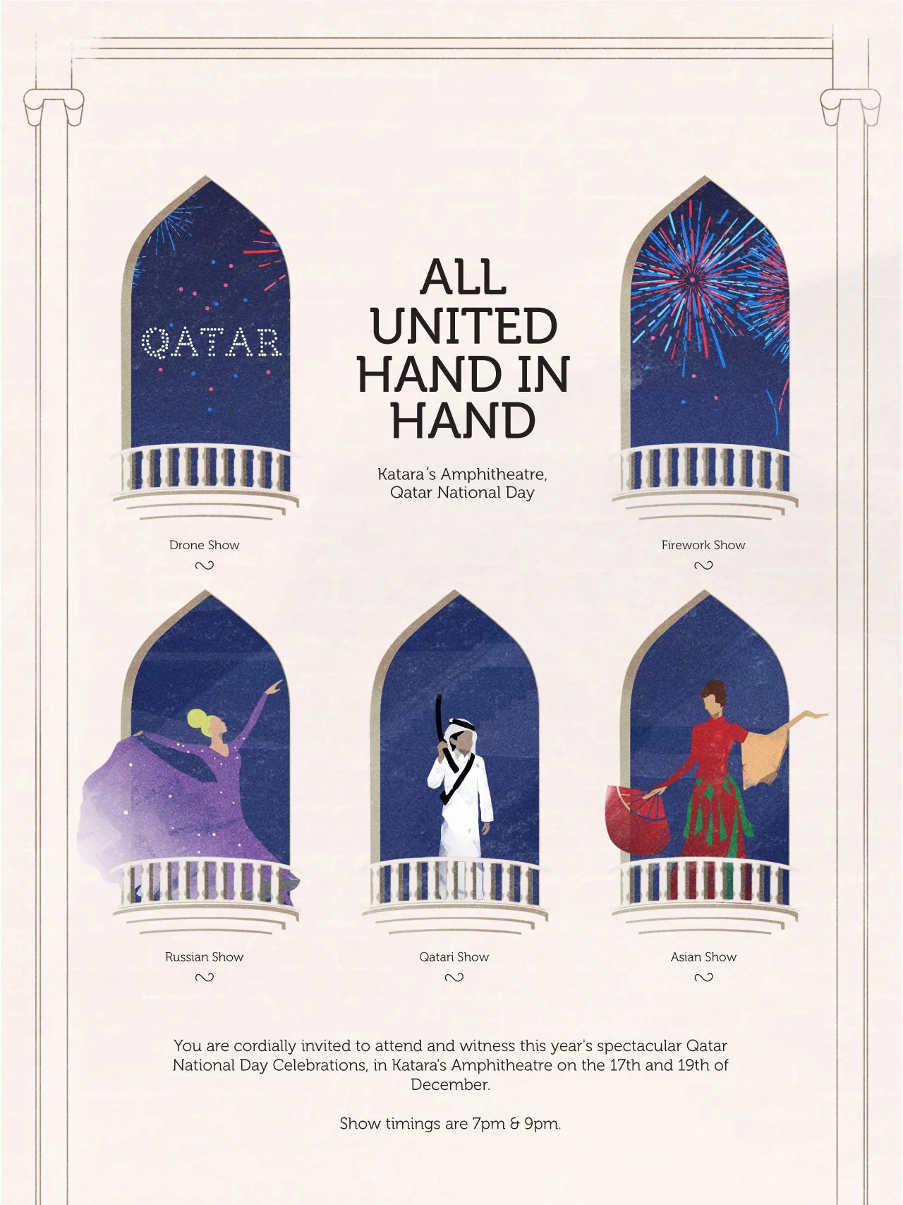 The Operate for the Qatar National Day held in the Amphitheater of Katara is a remarkable event and show that celebrates the country's rich culture and history through musical shows in collaboration with famous artists and talented performers. The event featured the first drone show in Qatar in its first edition, which was a stunning display of synchronized drones and lights that created mesmerizing patterns and shapes in the sky. The event was a testament to Qatar's commitment to innovation and creativity, and it left a lasting impression on the audience.
