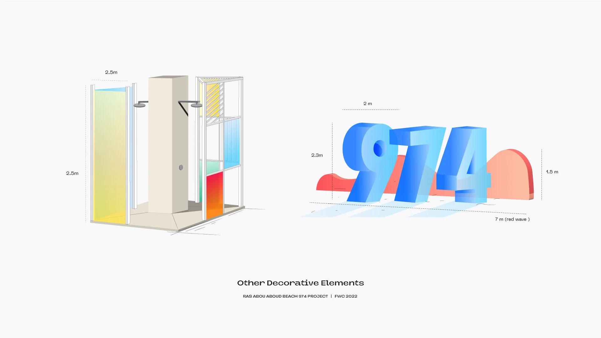 Rad Abu Aboud Beach 974 is a stunning beach located next to the 974 Stadium in Qatar that was opened during the FIFA World Cup 2022. The beach experience was enhanced with a unique branding concept, art installations, and decorations inspired by the industrial look of the stadium, creating an immersive and memorable experience for the fans and visitors alike. The color palette of the branding was carefully chosen to complement the industrial aesthetic, and the art installations were strategically placed to showcase the beauty of the beach while also highlighting the surrounding stadium.